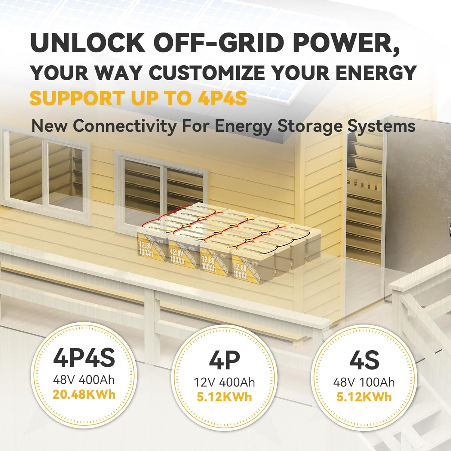 - 【Supports Series & Parallel Connections 】Power Queen 12V100Ah Premium Battery supports connections in series & parallel for a larger capacity. It supports up to 16*12V 100Ah Premium Lithium Battery in a 4P4S connection to set up a 51.2V 400Ah battery bank(Maximum energy output: 20.48kWh)