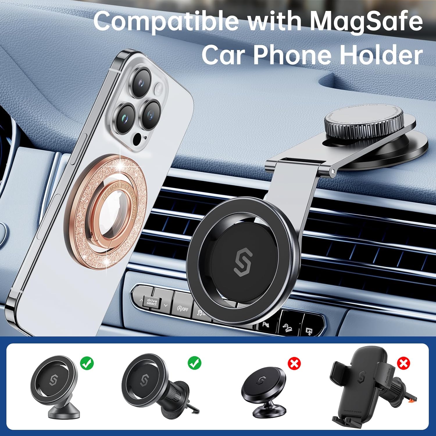 - 【Wide Compatibility】The Sycnwire MagSafe phone ring holder is designed specifically for use with MagSafe devices and certified MagSafe phone cases. The magnetic phone ring grip is also compatible with non-magnetic phones and standard phone cases with thin metal rings (provided) on their backs. Widely compatible with all Apple and Android smartphones, including iPhone 15/14/13/12 Series, iPhone 11/11Pro/X/XS/XS Max/8/7, Samsung GalaxyS23/S22/S21, Google Pixel P8 P7, and more.