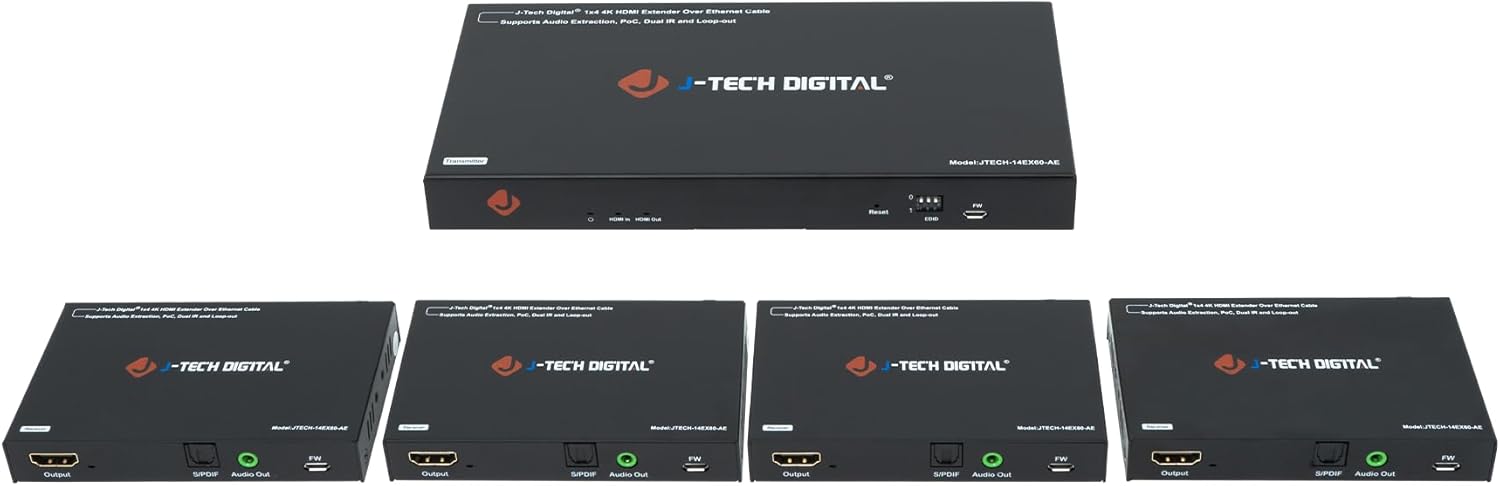 ![J-Tech Digital HDMI Extender Splitter 4K 60Hz 1 in 4 Out Over Single Cat5e/6 Ethernet Cable Up to 196ft. Supports 4K Downscale Audio Extraction PoC EDID Switch by [JTECH-14EX60-AE]](http://gizmodock21.com/cdn/shop/files/71tj7nlqlUL._AC_SL1500.jpg?v=1764912009&width=1445)