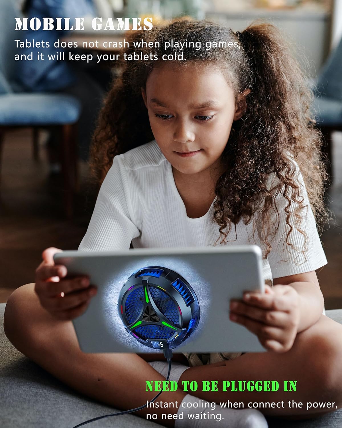 - ❄ 【SIMPLE CONTROL】Simply plug it in to use. It offers two cooling modes: Icebound and Freezing. The built-in Type-C port ensures plug-and-play functionality. (The package include a Charging cable/ Magnetic disk/Tablet stand holder.)