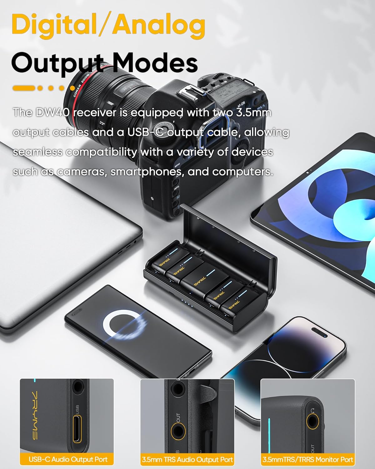 - 【Digital/Analog Output Modes】The DW40 wireless lavalier microphone offers USB C digital and 3.5mm analog output options. You can use this microphone kit to be compatible with a variety of cameras, smartphones, and computers, providing versatility for different recording scenarios.