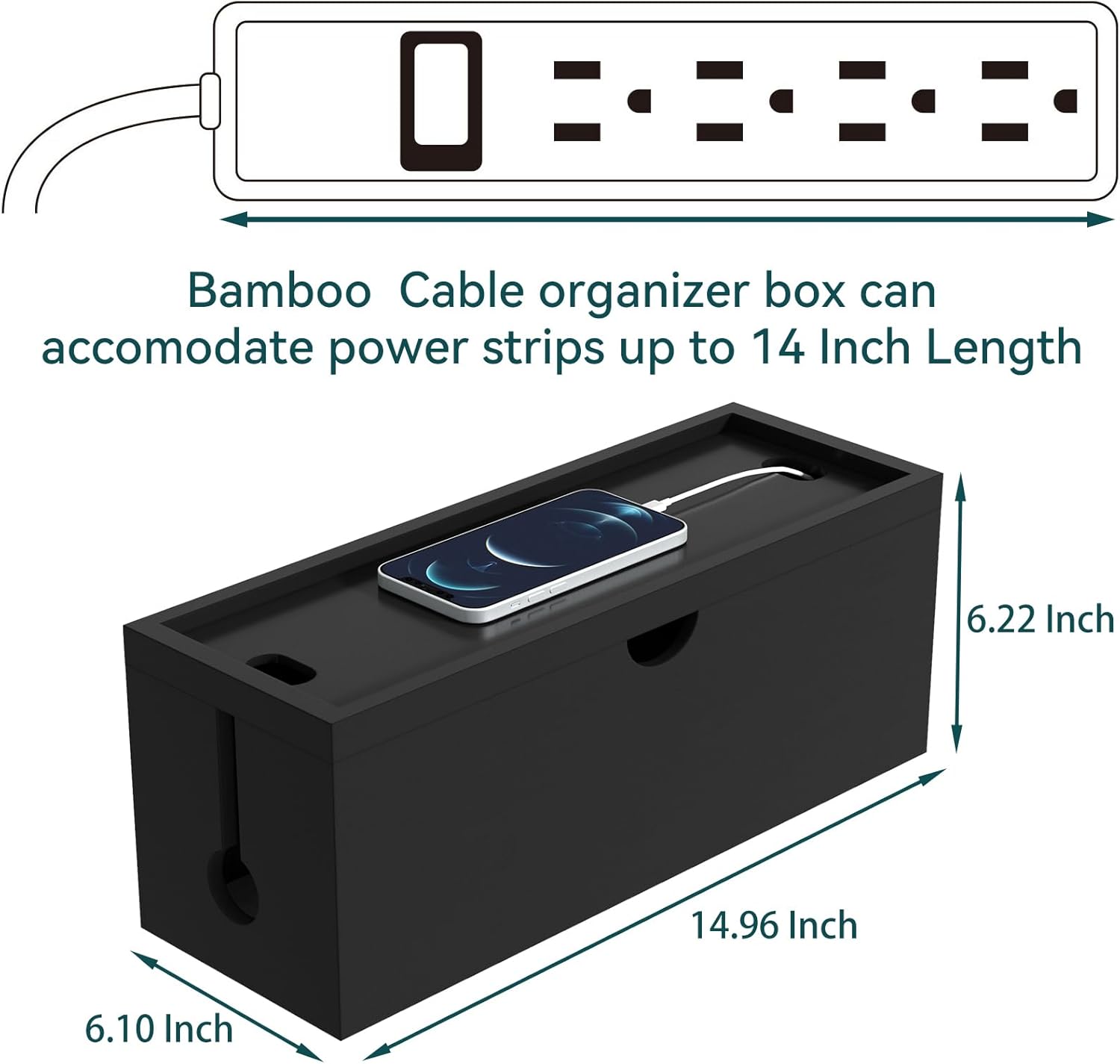 - 【More Than Cord Organizer Box】The magnetic lid of our bamboo cable management box can also work as a tray to store smartphones or other small devices while keeping the wires nicely popping out. ( Interior size---L: 13 inches; W: 5.12 inches; H: 5.51 inches)
