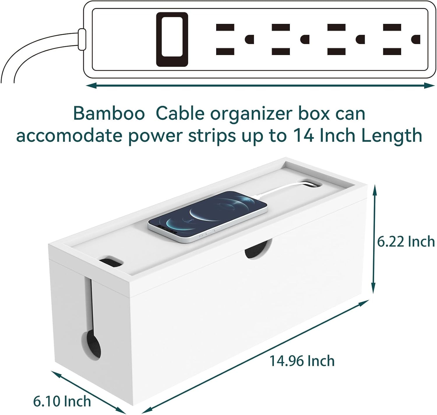- 【More Than Cord Organizer Box】The magnetic lid of our bamboo cable management box can also work as a tray to store smartphones or other small devices while keeping the wires nicely popping out. ( Interior size---L: 13 inches; W: 5.12 inches; H: 5.51 inches)