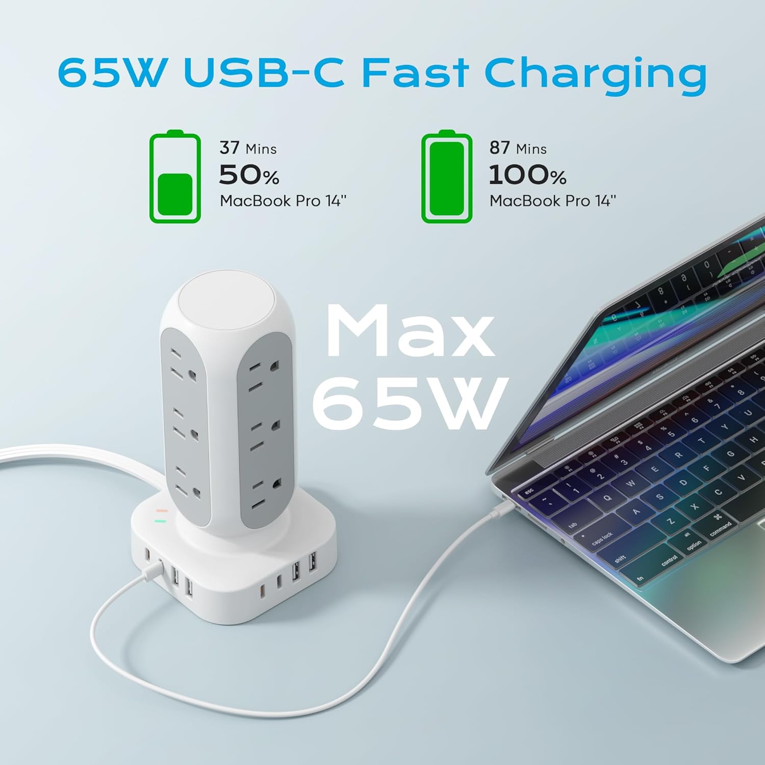 65W Fast Charging Station, Flat Plug Power Strip Tower with 12 AC Outlets & 8 USB Ports (2 PD USB-C Ports), 10FT Extension Cord, Compatible for MacBook Pro, iPhone Series.