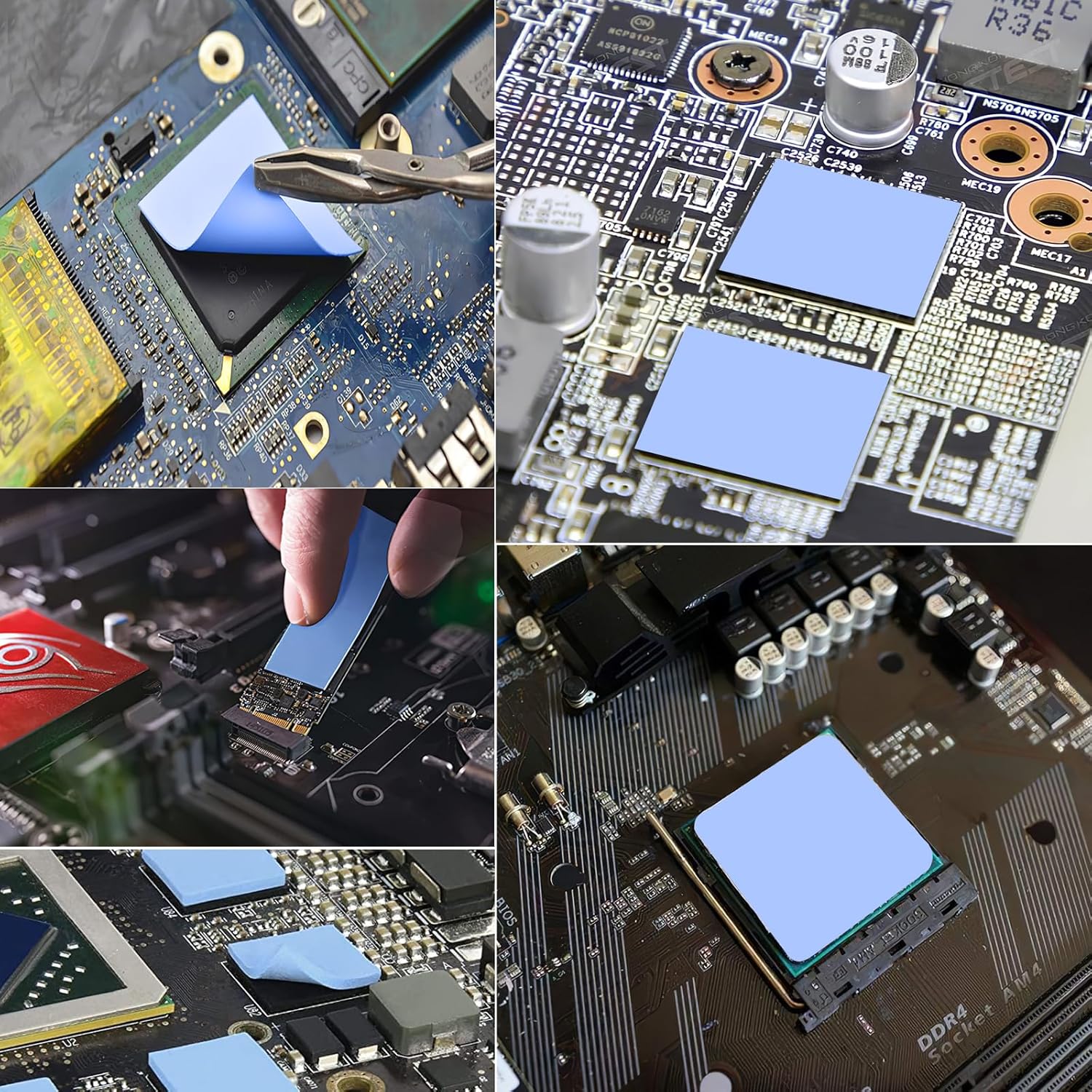 - WIDE APPLICATION: Thermal pads GPU is used in places where it is not possible to use thermal paste, Achieve the best cooling effect. 0.5mm/ 1.5mm/ 1mm thermal pad fits for Control board, game consoles, motor, electronics, micro controllers, auto mechanics, computer host, PCB surfaces, VGA cards, laptop, DVD, VCD, LID, Set-top box, LED IC SMD DIP, memory IC and any cooling modules