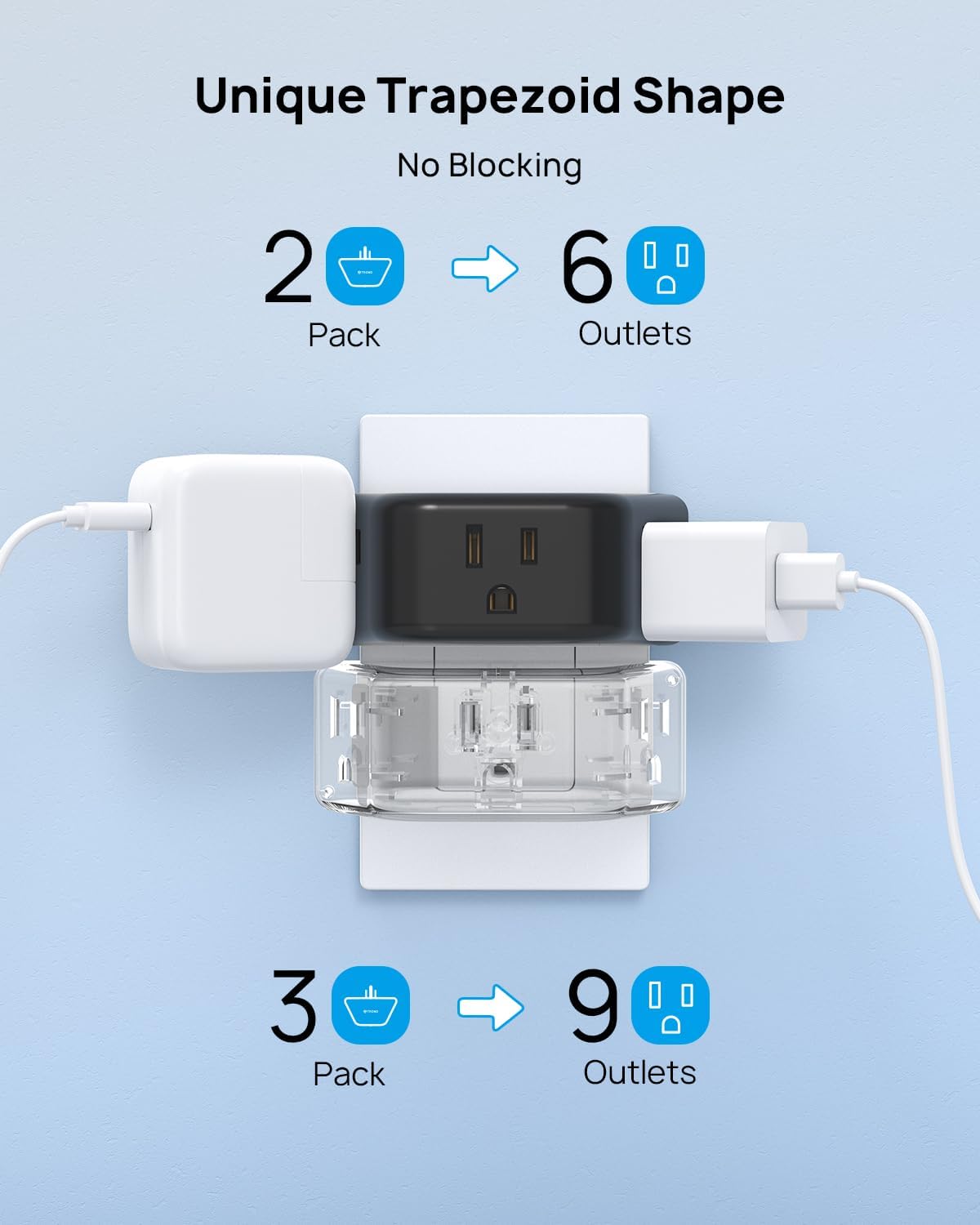 - Handy and Mighty: With the practicality of a 3-pack, you can charge up to nine devices simultaneously. This wall outlet extender is suitable for any occasion, especially bathrooms, kitchens, bedrooms, hotels, and college dorm rooms