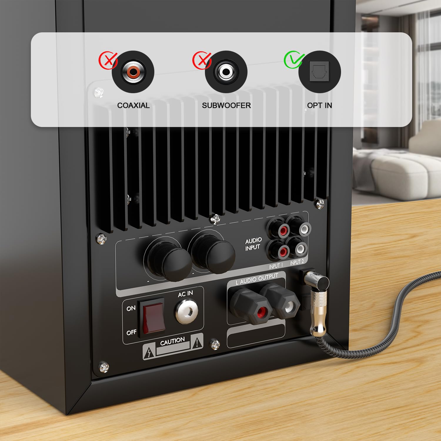 - 24K Gold-Plated 90° Toslink Compatibility - This right-angle optical cable seamlessly connects all standard and HD devices with Toslink (S/PDIF/optical) ports, including soundbars, AV receivers, DACs, TVs, Blu-ray players, computers, projectors, Roku devices and home theater systems, delivering perfect alignment for space-constrained installations without compromising digital audio quality.