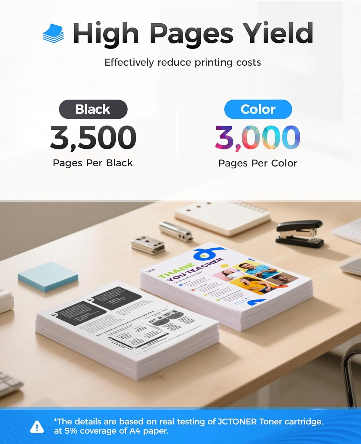 - High Page Yield: 3,500 pages per black toner cartridges, 3,000 pages for each Cyan, Magenta, Yellow (5% coverage of A4 paper).