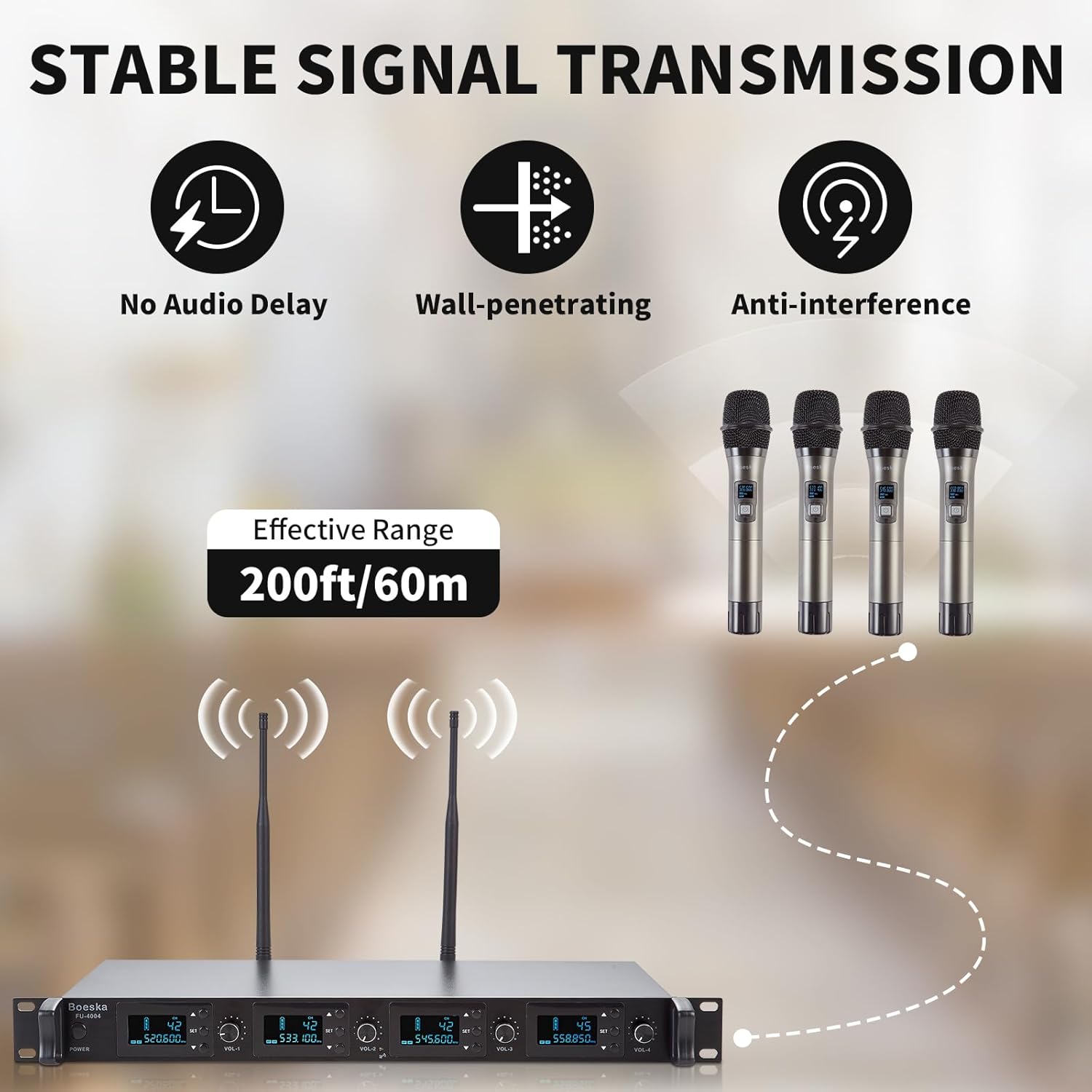 - UHF AUDIO TRANSMISSION: This cordless microphone system with exceptional performance and a high signal to noise ratio, it offers a superior audio transmission experience by effectively preventing crosstalk. The UHF wireless design ensures a stable signal and a working distance of up to 200 ft