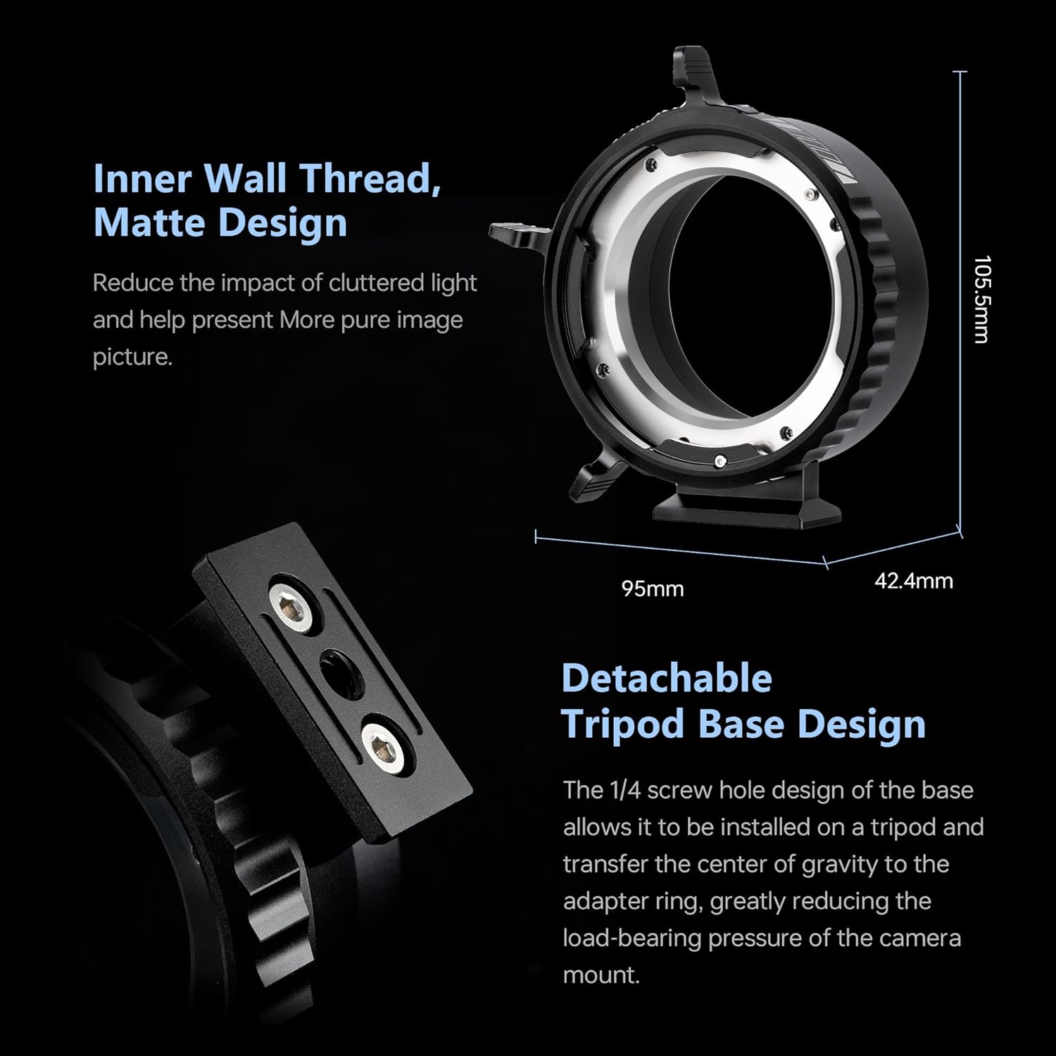 - 【Dust-proof design】The lens adapter is equipped with a rubber sealing ring to prevent dust and impurities from entering, keeping your equipment clean and protected. The Inner Thread Matting Design reduces the impact of cluttered light and helps present a purer image.