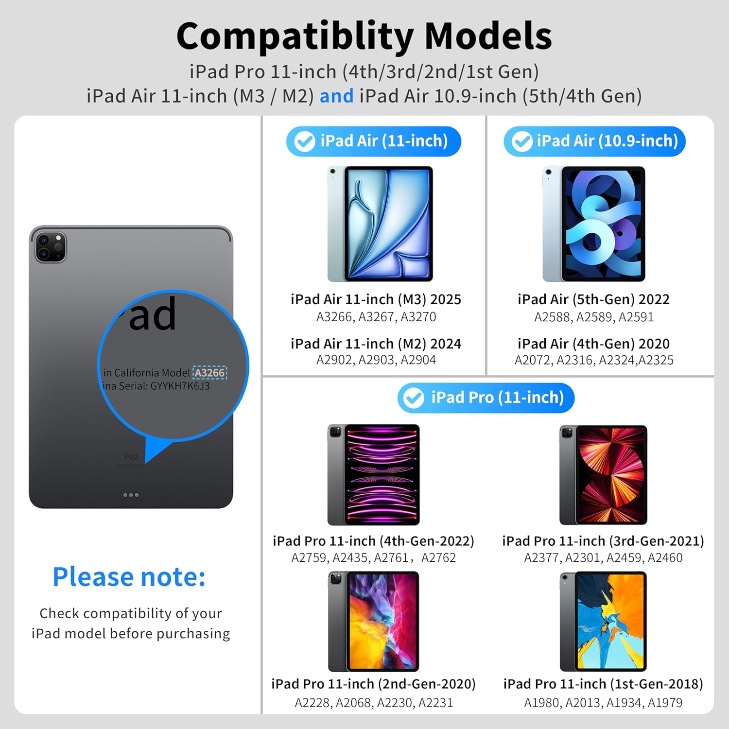 - Compatible Devices : iPad Air 10.9-inch (5th/4th Gen), iPad Air 11-inch (M3 2025 / M2 2024), iPad Pro 11-inch (4th/3rd/2nd/1st Gen) iPad Air 10.9-inch (5th/4th Gen), iPad Air 11-inch (M3 2025 / M2 2024), iPad Pro 11-inch (4th/3rd/2nd/1st Gen)