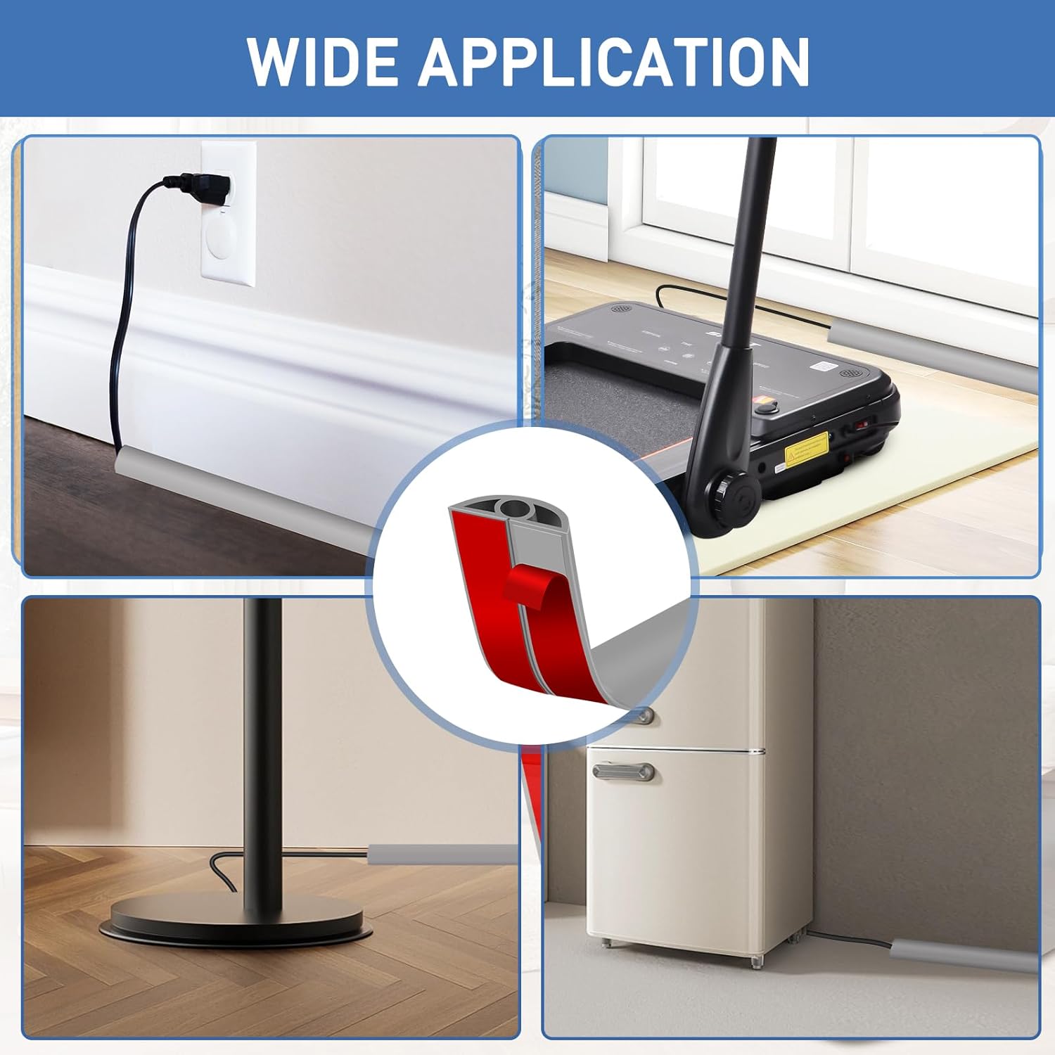 - Strong Adhesive Backing: The cord cover floor has a strong adhesive tape, making installation easy. Simply cut the desired length and place the wire in the channel. Peel off the film and stick it to any floor or wall edge, including hardwood floors, tiles, or carpets.