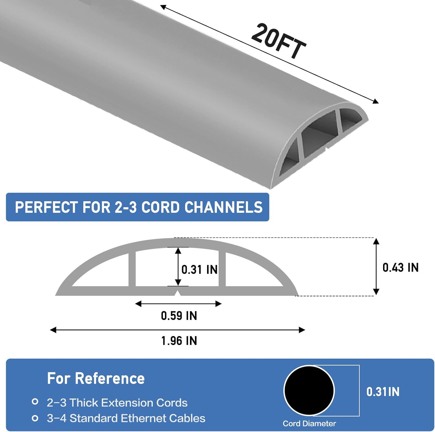 Floor Cord Cover Self Adhesive Cord Hider Floor Extension Cord Covers for Floor Power Cord Protector Cable Management Prevent Cable Trips Cable Cavity 0.59" W x 0.31" H (Grey, 20Ft)