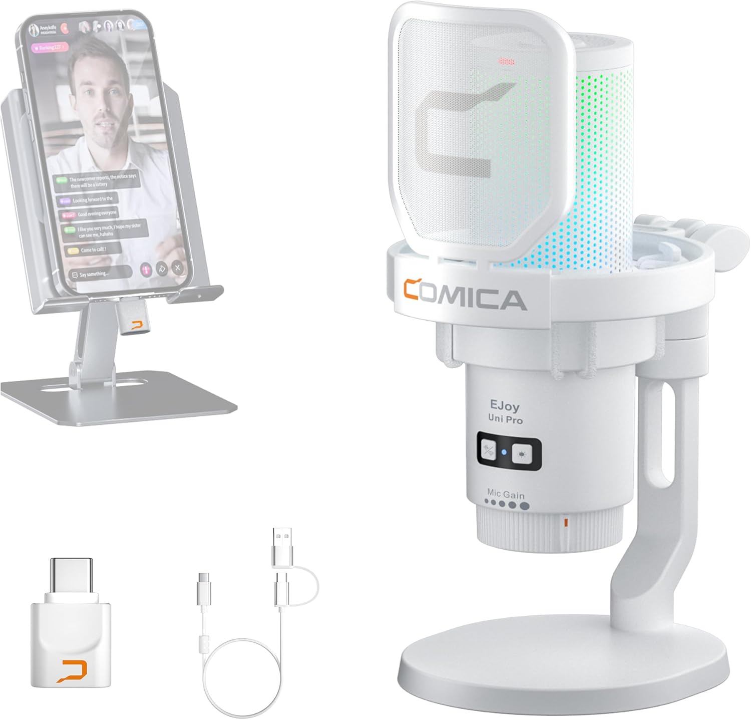 - 【Plug and Play, Compatible With MOST OS】 Comica Ejoy Uni Pro is compatible with a wide range of devices, including PS4/5, Windows Mac OS PC Computer Laptop, iPhone, iPad, Tablet, Type C devices, and Android. This gaming microphone USB mic offers seamless compatibility with your favorite gaming devices.