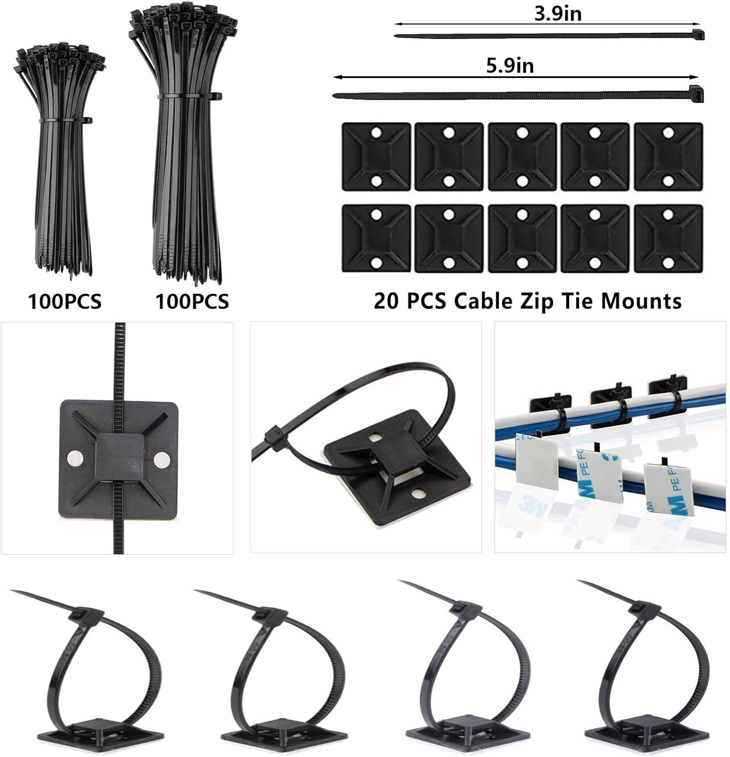 - 327 PCS Cable Management Kit:4 cord protector 20 in L x 0.4 in w,25 Cable Zip Ties,65Cable Clips 13Cord Holders,200 Cable Fastening Ties:100pcs 6 in x 0.12 in and 100 pc 4 in x 0.12 in,5 Self Adhesive Cable Tie Rolls, each roll is 39 in,20 Cable Zip Tie Mounts 3.54L x 1.1 inW