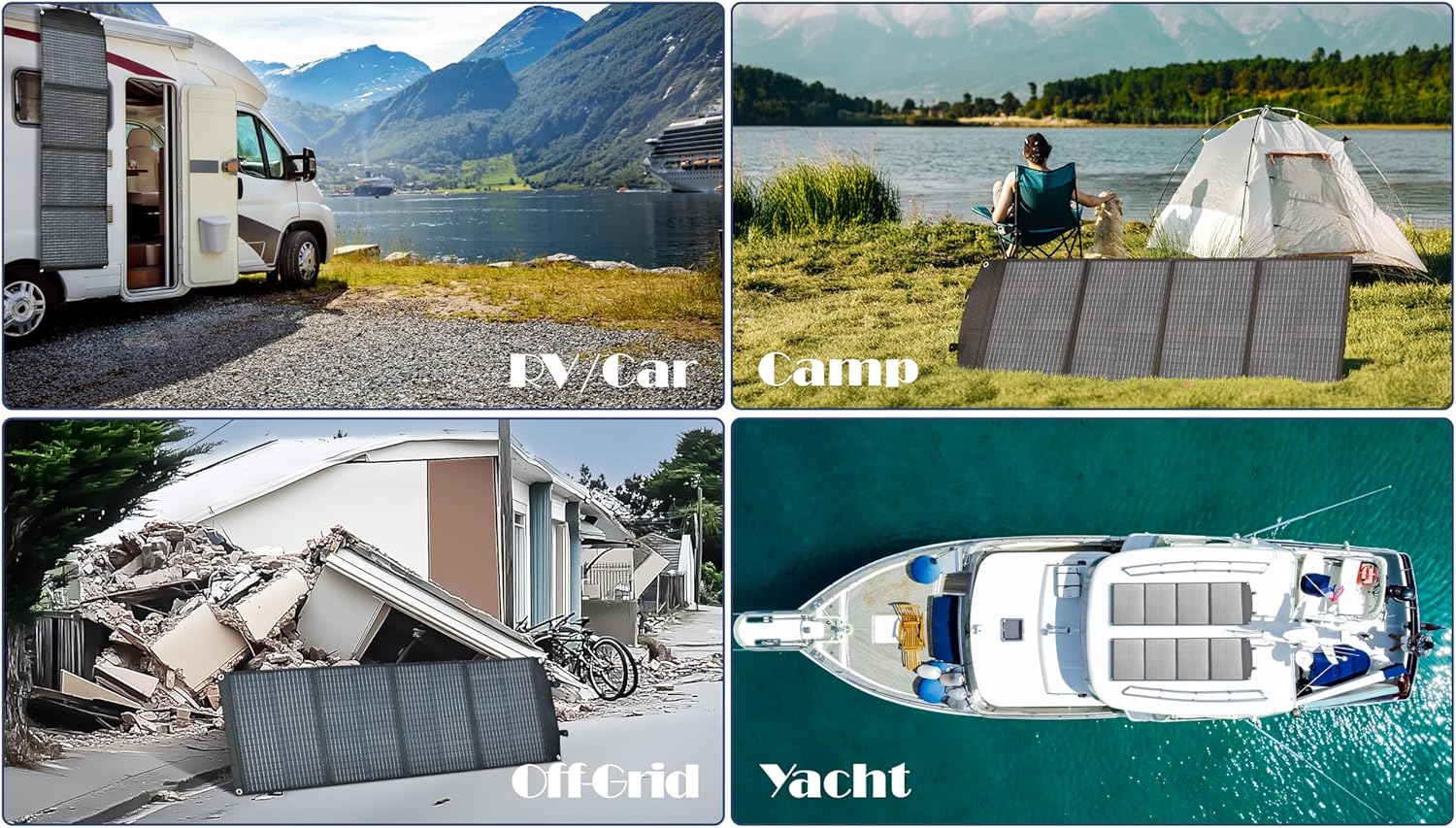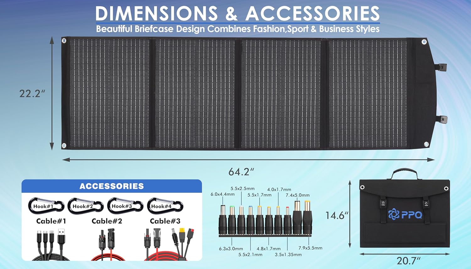 - 【Reliable 1-Year Guarantee】The Solar Panel Kit comes with a Panel(Folded Size:22"x20"|Unfolded Size:22"x87"|14.7 lb), with accessories including PANEL-MC4 Cable, MC4-Anderson/XT60/DC Cable, Dual DC Cable, DC 10-in-1 Connector, USB 3-in-1 Connector, 4 Carabiner Hooks, all backed by our commitment to high quality.