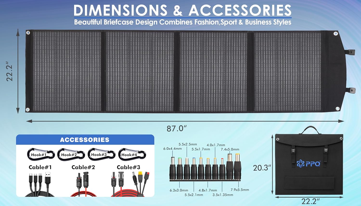 - 【Reliable 1-Year Guarantee】The Solar Panel Kit comes with a Panel(Folded Size:22"x20"|Unfolded Size:22"x87"|14.7 lb), with accessories including PANEL-MC4 Cable, MC4-Anderson/XT60/DC Cable, Dual DC Cable, DC 10-in-1 Connector, USB 3-in-1 Connector, 4 Carabiner Hooks, all backed by our commitment to high quality.