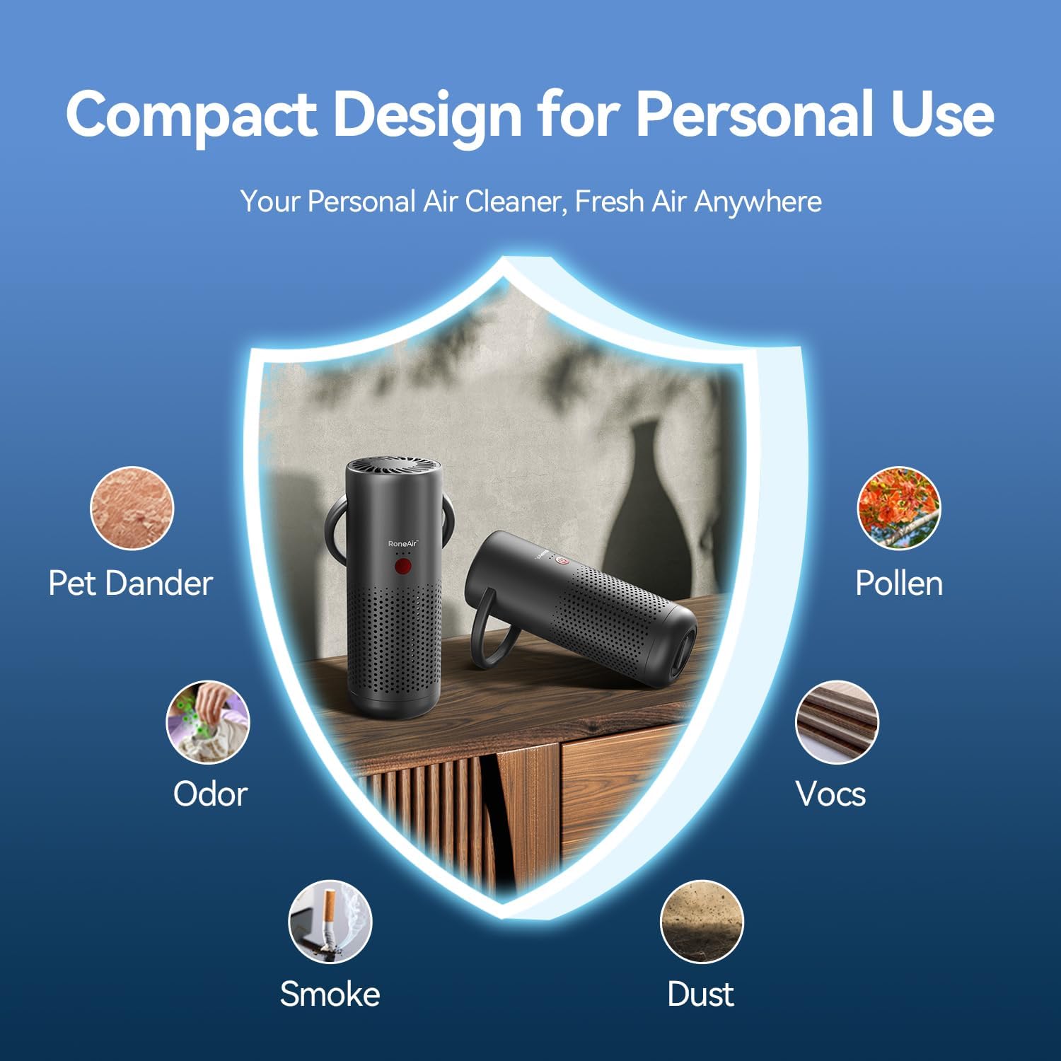 - Compact Design for Personal Use: Embrace the clean air with our compact and stylish Personal Air Cleaner. Designed for small spaces, it's the perfect companion for your desktop, office, or travel bag. Enjoy personalized air purification that fits your lifestyle.