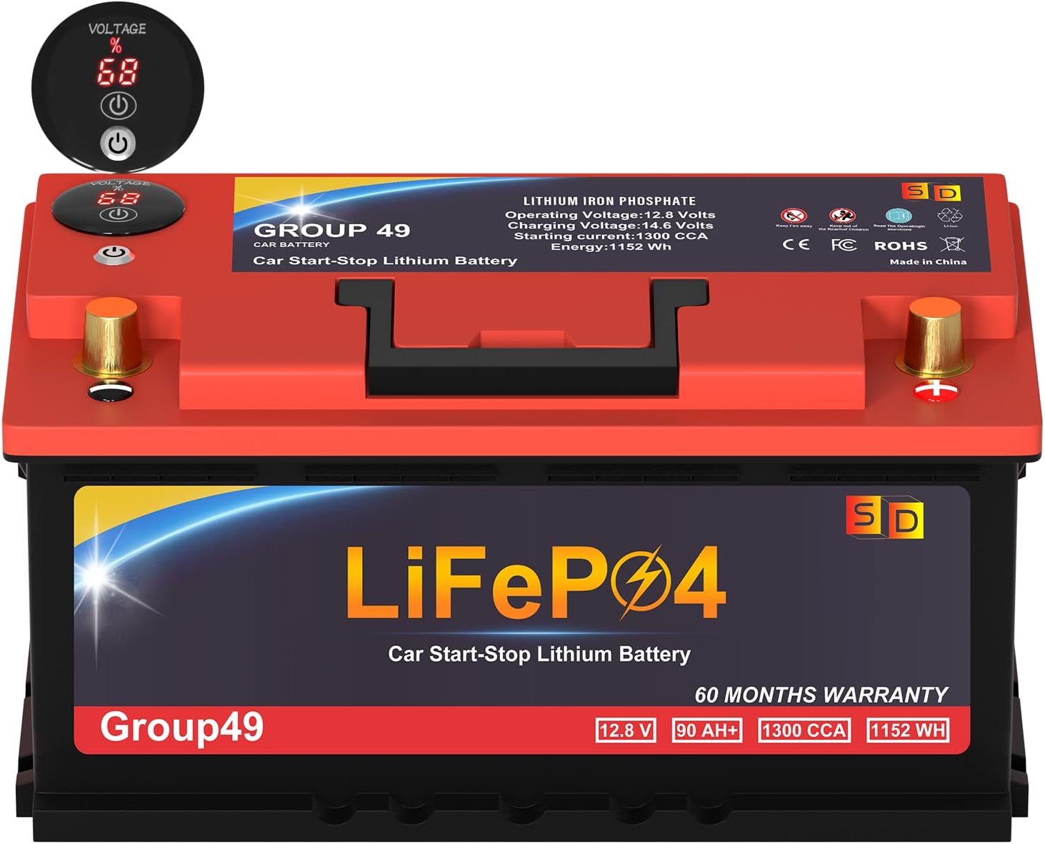 Car Battery GROUP 49 Start and Stop Lithium-ion Car Battery, 12.8V 90Ah 1300CCA LiFePO4 Automotive Battery For Car, With LED Display and Emergency Start Button 60 Months Warranty