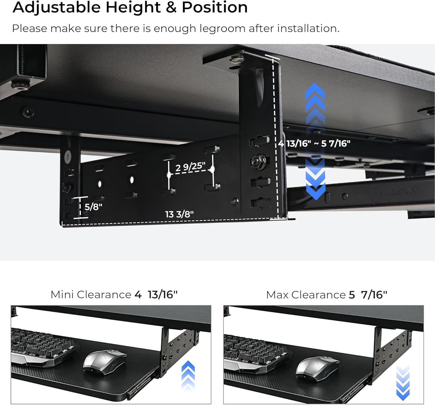 - 【Wide Compatibility】: This keyboard drawer is designed to be compatible with a wide range of desks, and is suitable for desktops made of materials such as wood, MDF, or other materials with similar characteristics (not compatible with plastic, hollow core panel, stone, glass, etc.). The keyboard shelf can be easily mounted under the desk for flexibility in adding desktop space. Note: The under-desk installation space should be 34"L x 15"W, with a minimum distance of 30" from the bottom of the tabletop to the floor. The desk should also be at least 0.59" thick. Please double-check the measurements and ensure there is enough legroom after installation before purchasing.