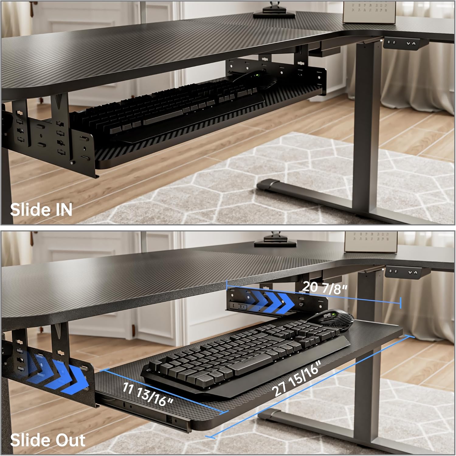 - 【Larger Size for More Comfortable Typing】: This slide out keyboard tray measures 27.95x11.82in, and the increased area allows you to place your keyboard, mouse, or other items easily. It also offers space for freedom of movement and type. You can find the perfect ergonomic setup for keyboard mouse tray, providing optimal comfort and support for your wrists and hands while typing.