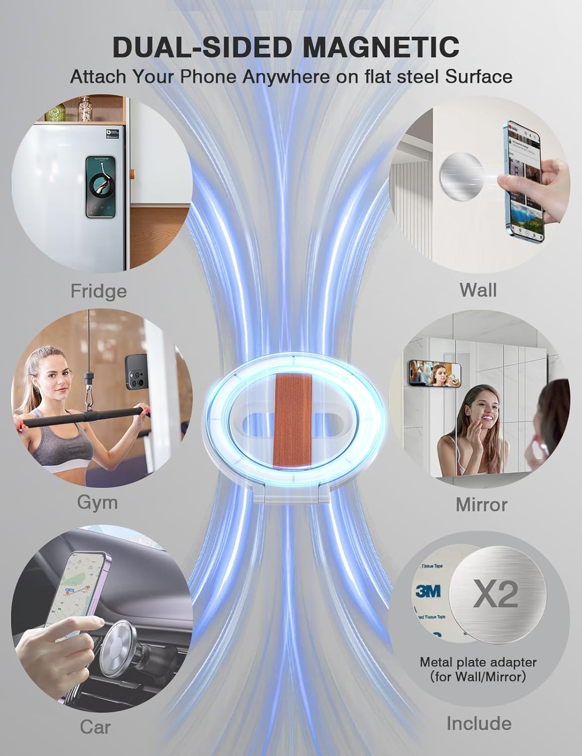 - 【Dual-sided Magnetic - More Snap Bridge】This innovative design incorporates super-strong N52 dual-sided magnets to make both sides of the stand super-functional! The stand can be securely attached to the MagSafe case and used on any magnetic metal surface, including car mounts, fitness equipment, refrigerators, and metal shelves. One metal plate are included as a gift, allowing the stand to be snapped to any non-magnetic surface, such as mirrors, bathroom fixtures, or wooden furniture.