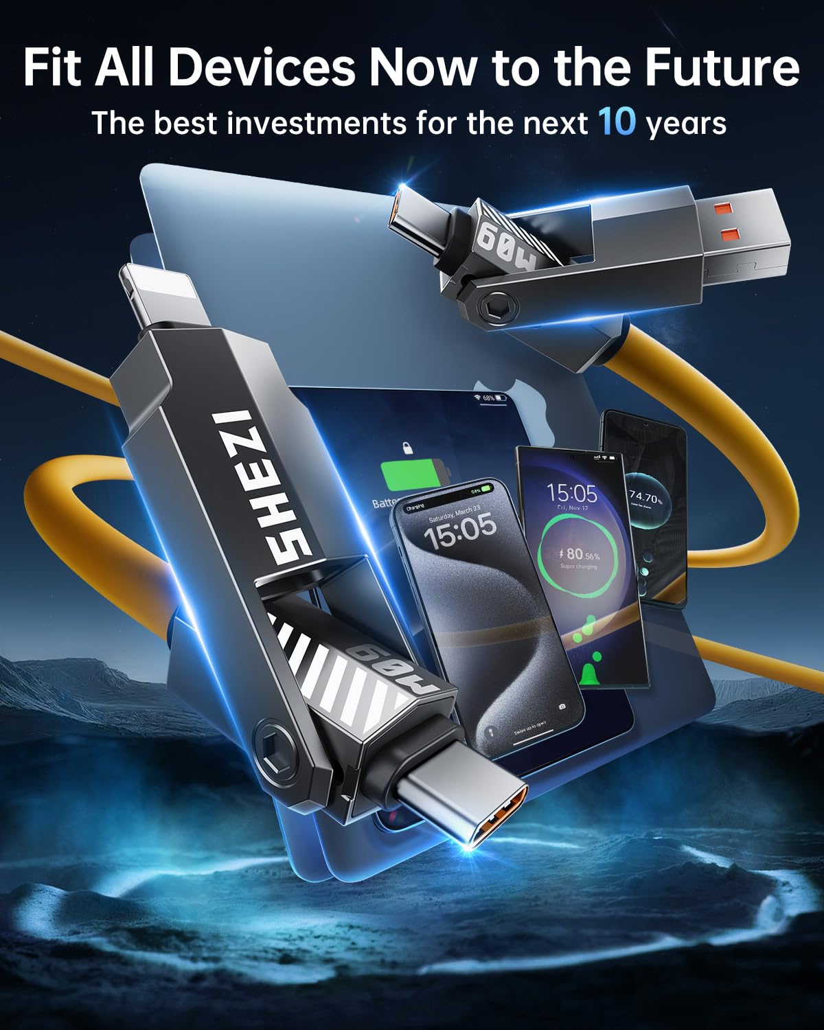 - Versatile 4-in-1 Design: SHEZI upgraded 4-in-1 multi charging cable adopts a rocket shape design of multiple ports, which meets your variety of charging needs in one cable.Charge and sync your devices without the hassle of switching between multiple cables. Simplify your charging setup with our versatile 4-in-1 usb-c cable.
