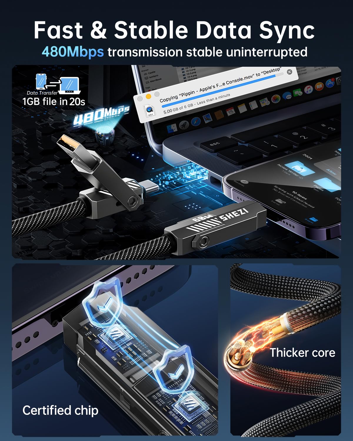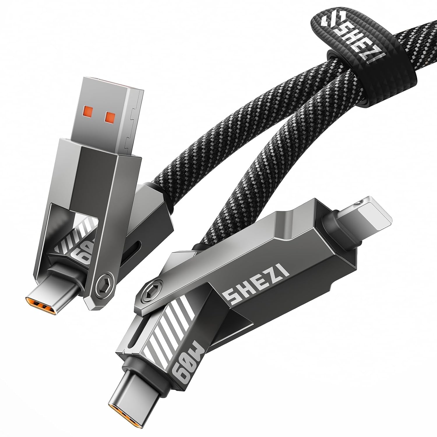- Versatile 4-in-1 Design: SHEZI upgraded 4-in-1 multi charging cable adopts a rocket shape design of multiple ports, which meets your variety of charging needs in one cable.Charge and sync your devices without the hassle of switching between multiple cables. Simplify your charging setup with our versatile 4-in-1 usb-c cable.