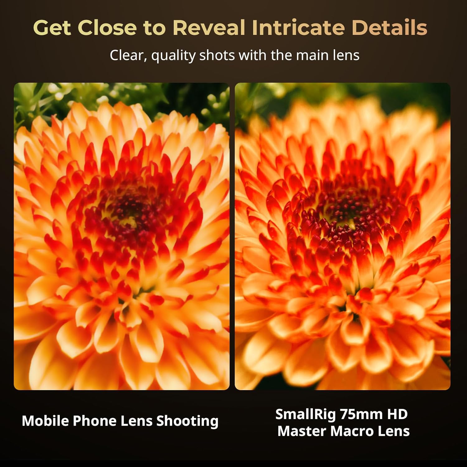 - 【Professional Macro Lens for Videography】SmallRig 75mm Macro Lens (T-mount) 4588 is designed to enhance your mobile photography experience. It works seamlessly with your phone's main camera to deliver stunning macro photos. This lens offers improved color reproduction and superior image clarity, surpassing that of standard lenses.