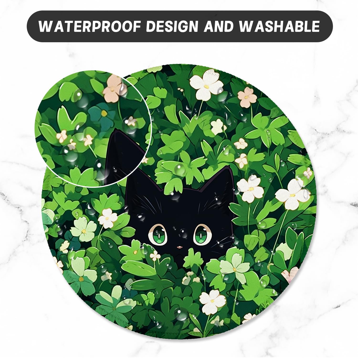 ITNRSIIET Round Mouse Pad with Stitched Edge Premium-Textured Waterproof Non-Slip Rubber Base Desktop Protection Mat Diameter 8.7 inches, Green Leave Cat