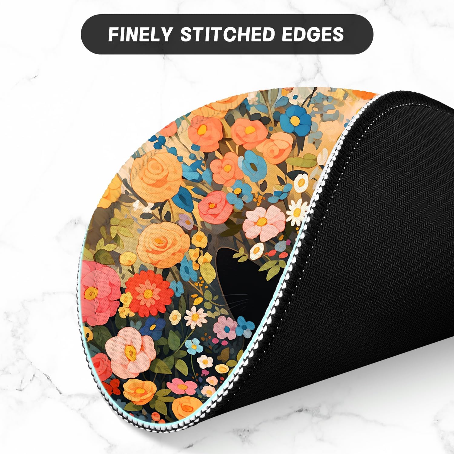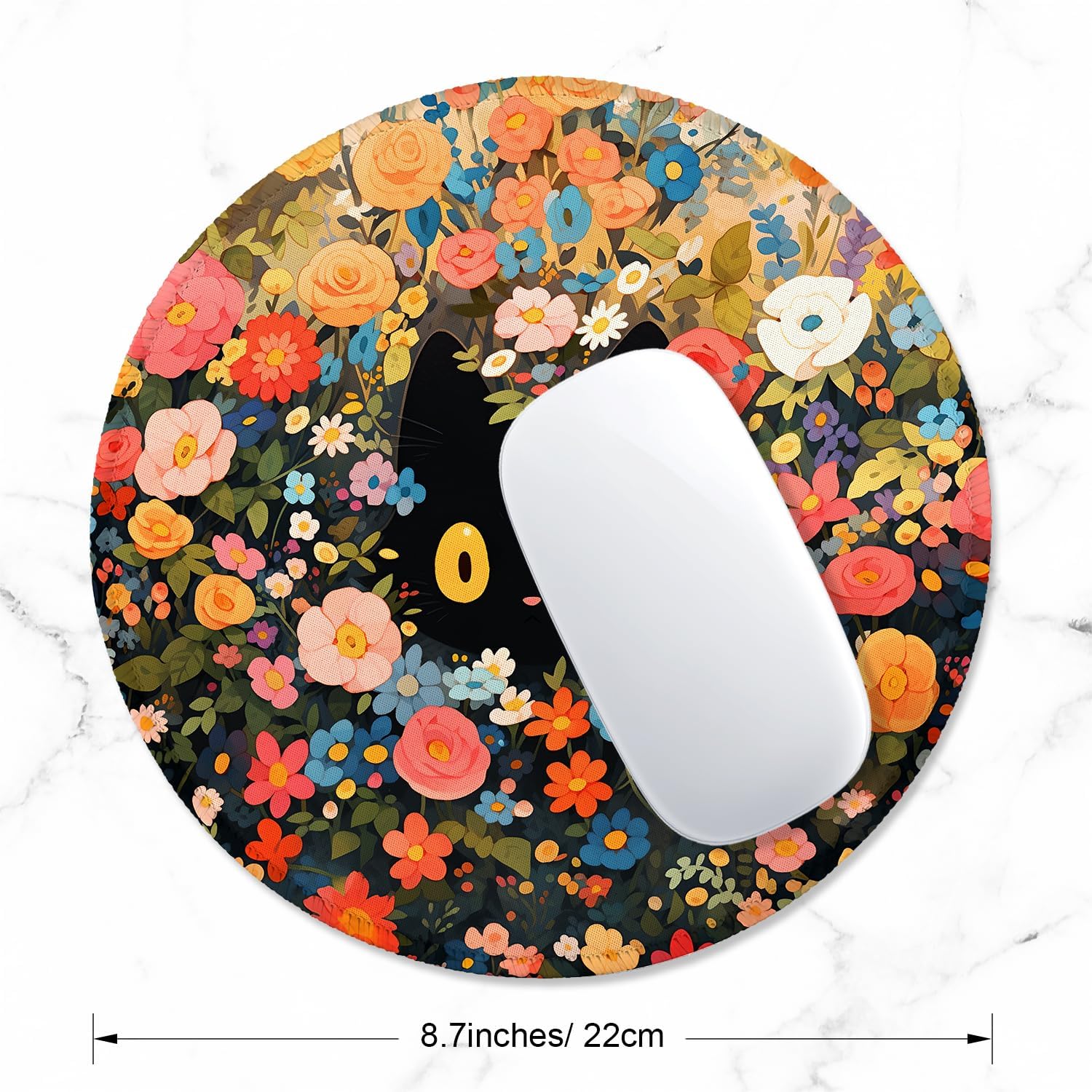 ITNRSIIET Round Mouse Pad with Stitched Edge Premium-Textured Waterproof Non-Slip Rubber Base Desktop Protection Mat Diameter 8.7 inches, Flower Cat