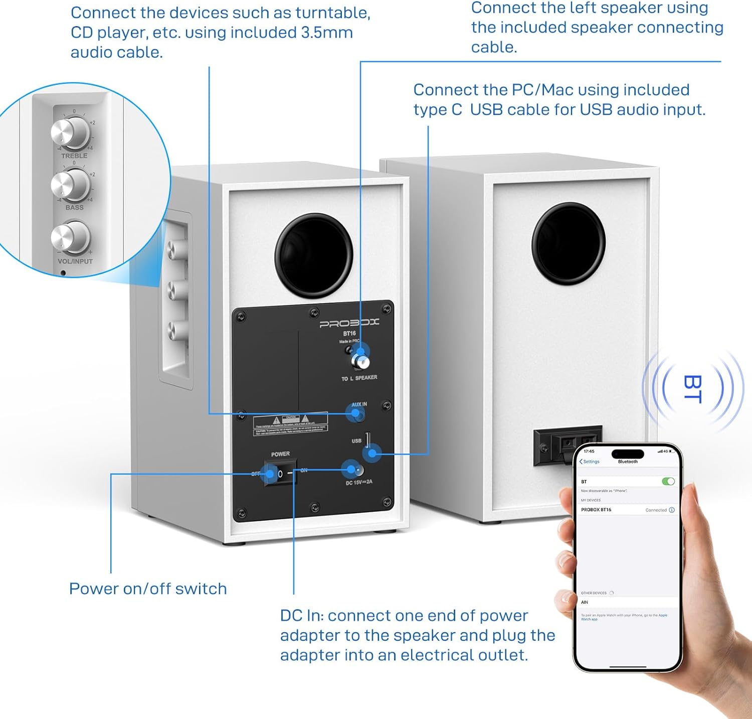 - 【TREBLE AND BASS ADJUSTMENT】Achieve true HiFi sound with the adjustable treble and bass knobs located on the side of the main speaker. Customize the sound to your liking or optimize it according to different audio types for the best listening experience.