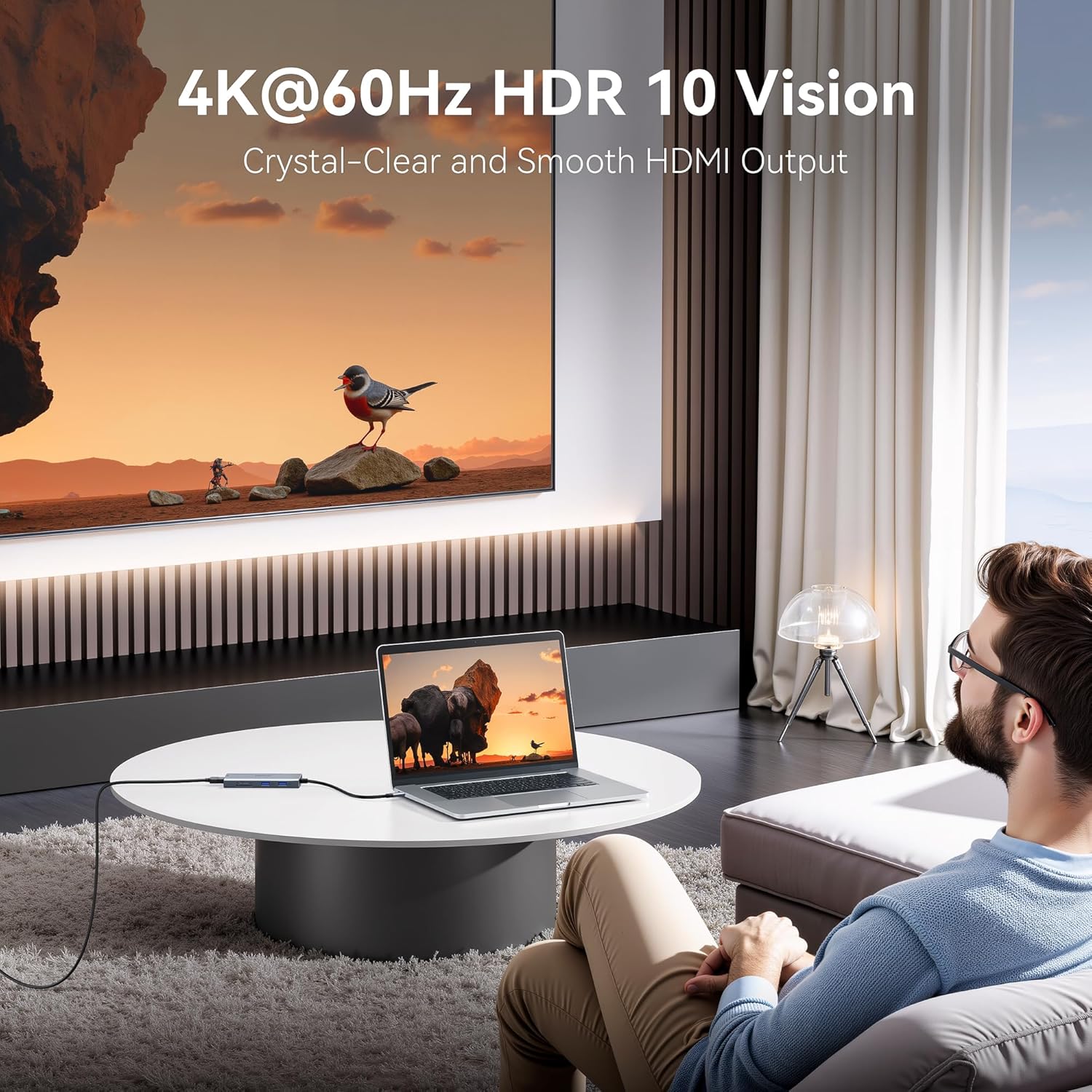- 4K@60Hz HDMI to USB C hub: This Macbook pro air accessories allows you to achieve up to 4K@60Hz (3840 x 2160) cystal-clear image,down compatible with 2K@120Hz, 1080P. This macbook air accessories adapter allows to mirror or extend your laptop screens or monitors by connecting monitors tvs projectors with hdmi ports. Please note that your usb c device’s usb c port must supportsvideo output (display port alt mode or thunderbolt), otherwise it will won’t output images on monitors or screens