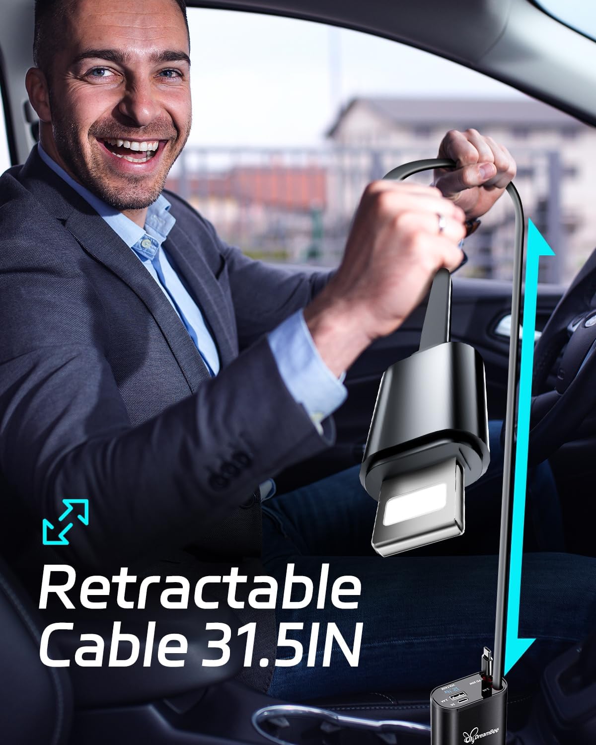 - 【Rigorously Tested Retractable Cable】Our retractable car charger has Dual 31.5IN long retractable cables for easy storage and to keep your car neat and organized. No more tangled cables or cluttered compartments! Tips:【This car charger is only for charging, and cannot be used for CarPlay】