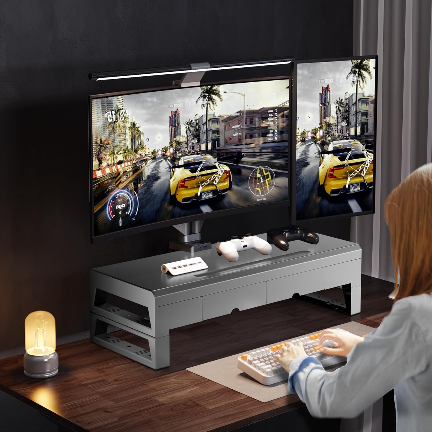- 【Wide Compatibility】The monitor riser has a universal size design, compatible with printers, computers, and laptops. Its desk leg width can accommodate most keyboards, and the non-slip rubber pads provide stability during use