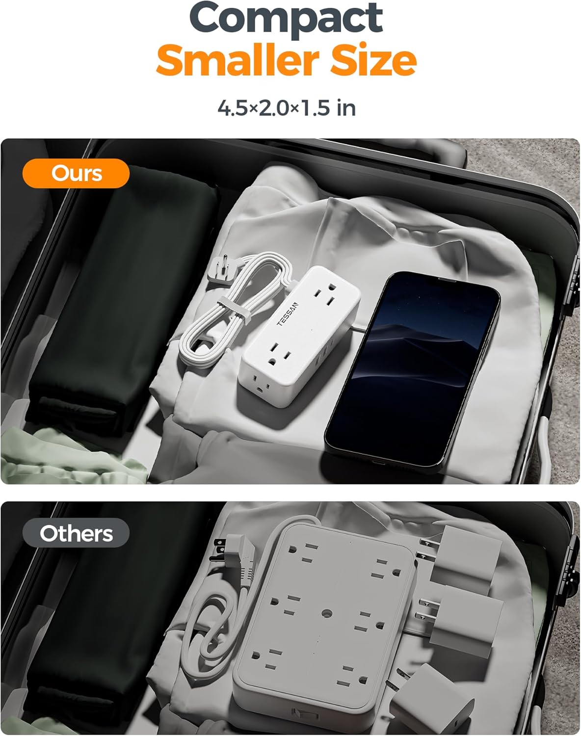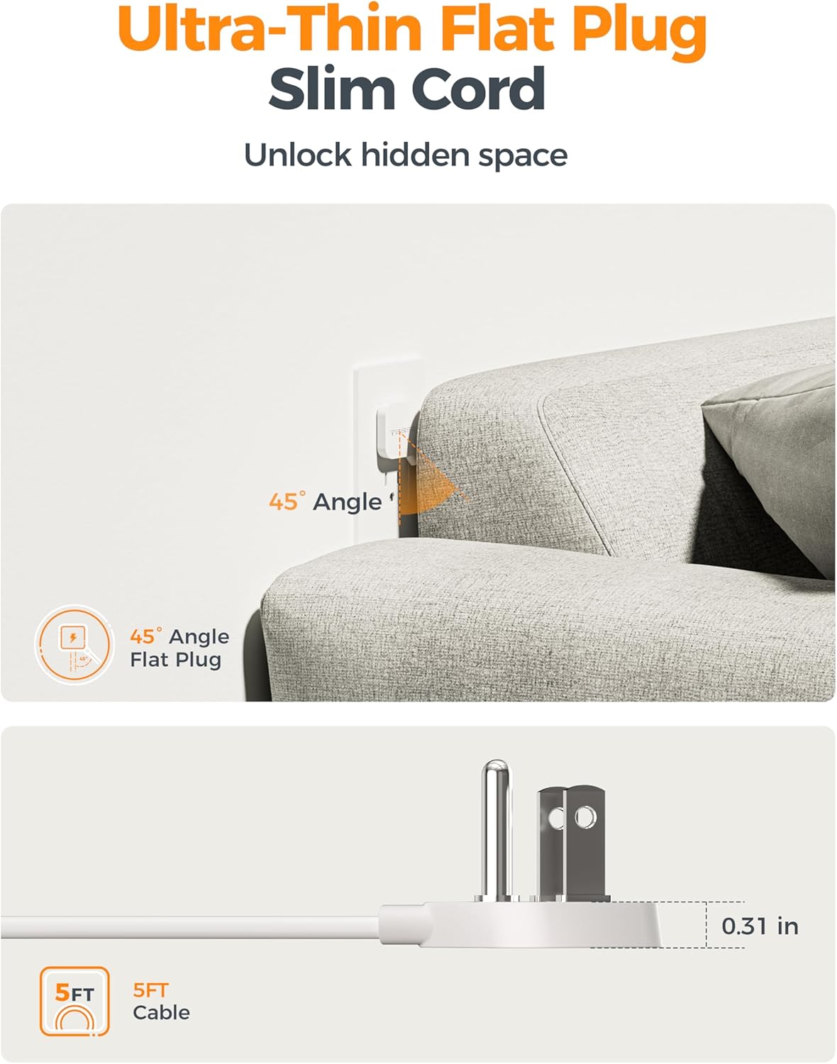 - Right Angle Flat Plug: Flat extension cord with an ultra thin 0.31in flat head, this mini extension cord power strip can easily fit into tight spaces and hide behind sofa, bed; The 45 degree right angle design creates additional space for other plugs
