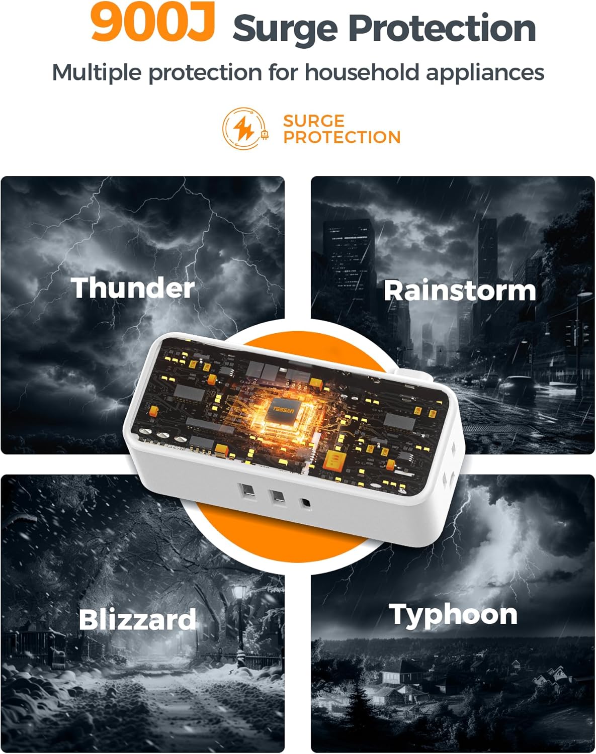 - 900J Surge Protector Outlet: Flat power strip with overload, short-circuit & over-current protection; Protects appliances from lightning, surges & spikes at home, office, dorm, etc; Indicator light stays on when working; The light off means the surge protection may have failed