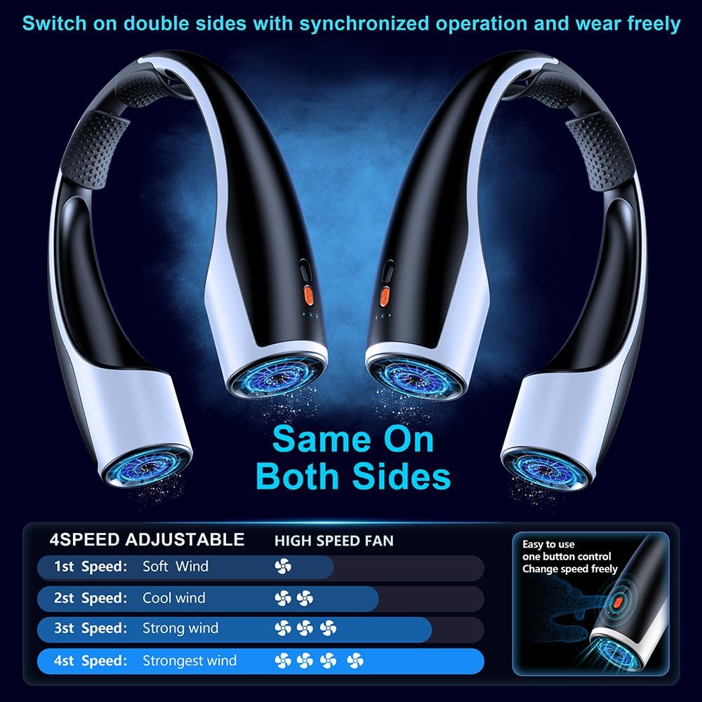 - Next-Gen AI Neck Fan - Experience a superior level of cooling with our upgraded AI portable and wearable fan, featuring two turbine motor fans that provide 360° airflow around your neck and face. The scientifically designed air outlets ensure you can enjoy a refreshing breeze from all angles, keeping you cool even when out in high temperatures.