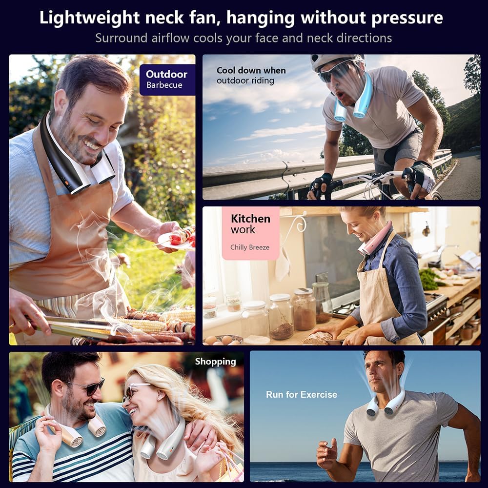 - Suitable for Multiple Scenarios - The personal neck fan helps keep you cool during various outdoor activities like gardening, traveling, hiking, biking, and concerts. It is also suitable for all indoor scenarios, ensuring you stay cool whether you're working, exercising, cooking, or enduring hot environments.