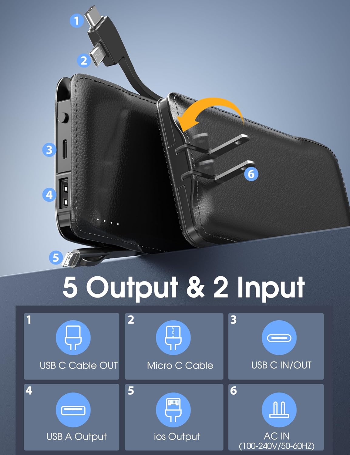 - Portable Charger with Foldable AC Wall Plug and Cables:there is an ac wall plug and cables built-in the portable cell phone charger,allowing to recharge itself directly from the wall outlet and power your phone with the built-in cord,No additional cables are required