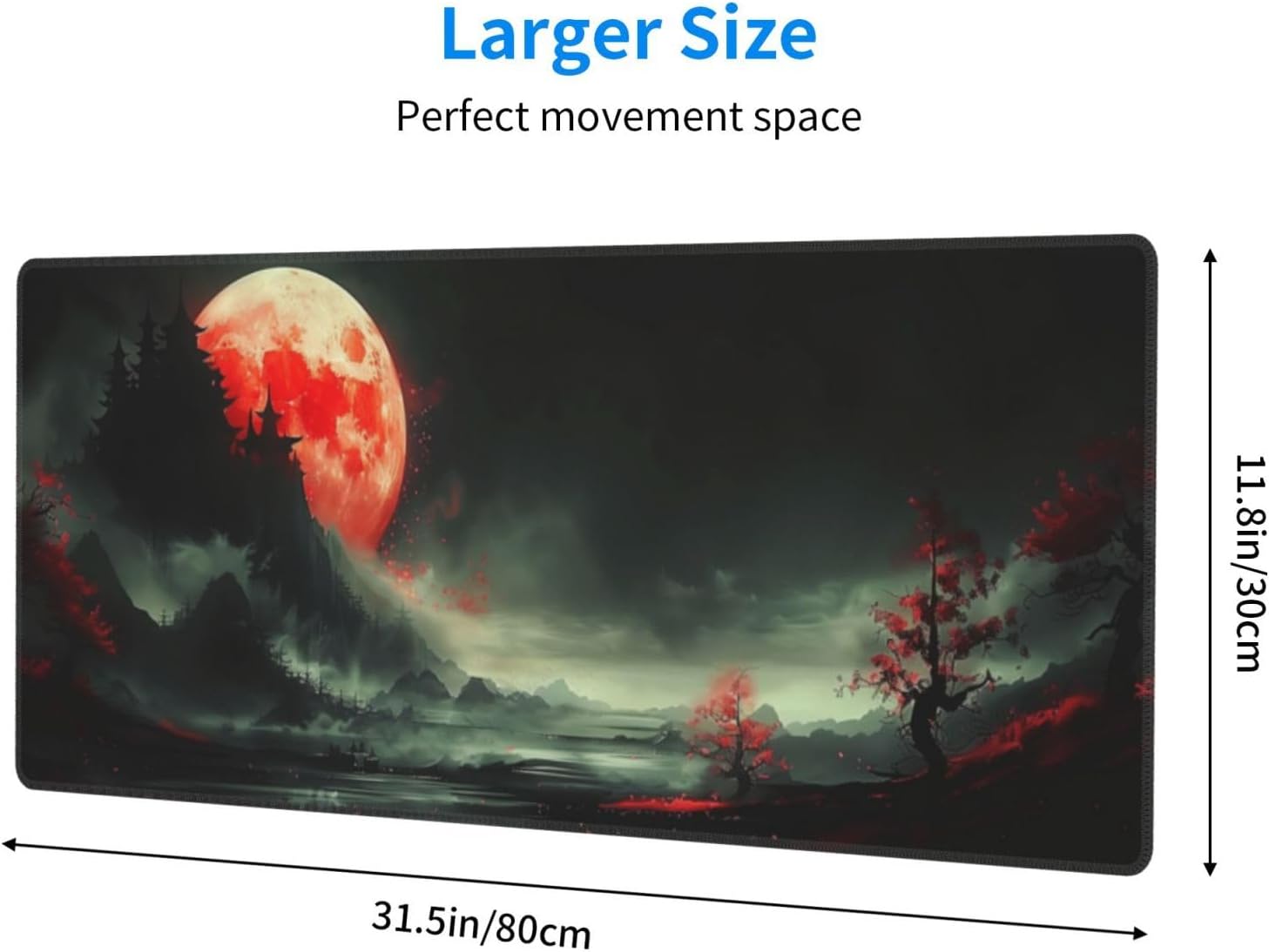 Extended Gaming Mouse Pad, Large Desk Mat XL Anime Mouse Pad Waterproof with Stitched Edges, Non-Slip Desktop Pad for Home and Office, Level Up Your 31.5x11.8 Inch (Red Moon)