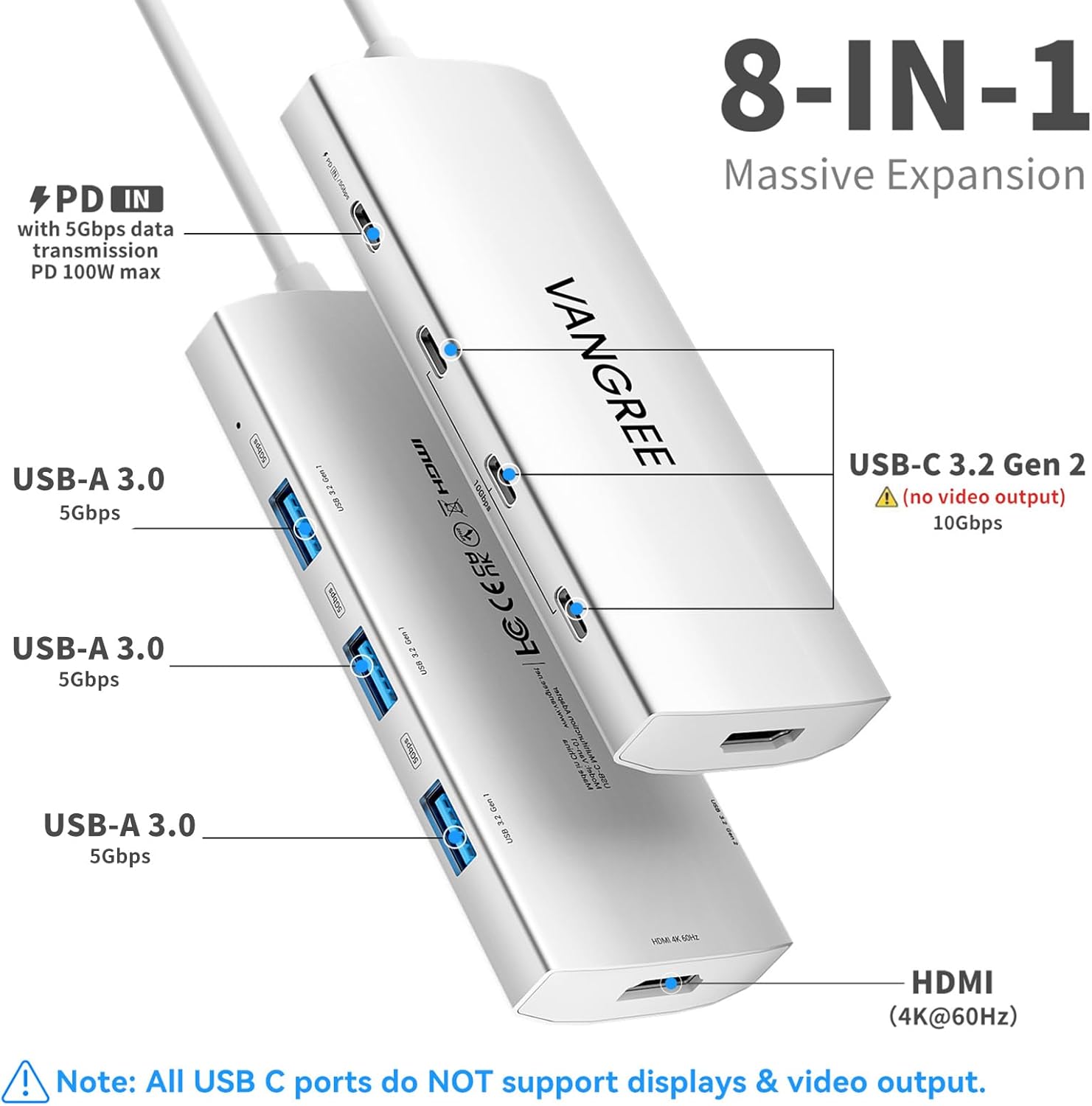 USB C Hub 8 in 1 Multiport Adapter, 3 USB 3.2 Gen 2 Ports with 10Gbps, 3 USB-A 3.0 5Gbps, 4K@60Hz HDMI, 100W PD, USBC Splitter for MacBook Pro, iPad Pro, Mac mini and More(Not Support USB-C Monitor)