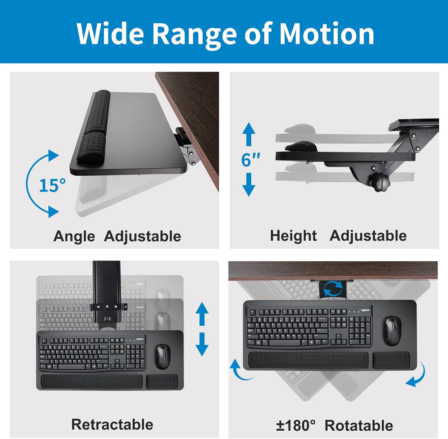 - 【Full Motion Under Desk Keyboard Tray】 The platform can swivel left and right 180 degrees. It can also tilt 7 degrees up and 22 degrees down for improved comfort.