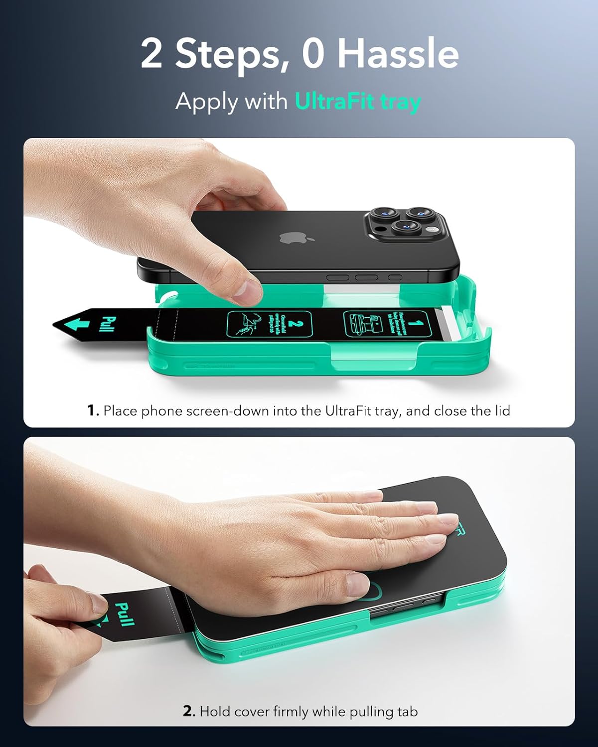 - In the Box: ESR Armorite screen protectors (3 pack, only for iPhone 16 Pro Max), UltraFit tray, cleaning kit, and manual