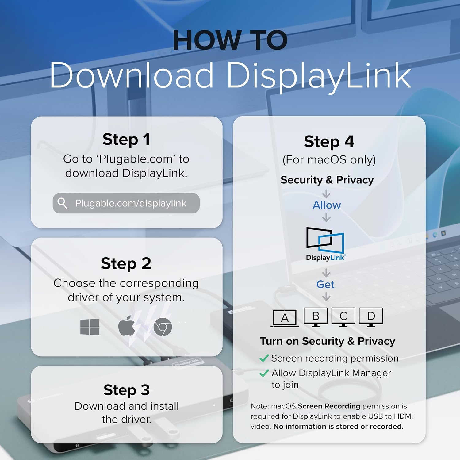 - Quad Display: Featuring the power of Thunderbolt and the flexibility of DisplayLink technology, connect up to 4 displays (2x HDMI, 2x Thunderbolt). All four displays up to 4K or a single 8K display (Thunderbolt/USB-C display output capabilities determined by the host system). Note: The DisplayLink software application must be installed on a Windows or Mac computer for the dock’s HDMI video outputs to function. This process is typically automatic on Windows, manual install required on macOS.