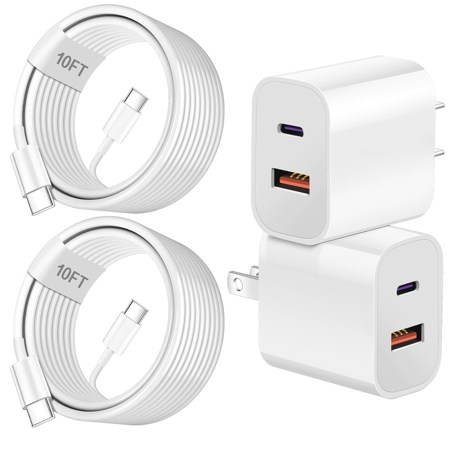 - Double A/C Fast iPhone 16 15 Charger Block Safety and Reliable: The 20W Double A/C Power Delivery Wall Charger for iPhone 16 15/iPad Pro Owns a Built-in Multi-Protection System,Avoiding Over-Voltage,Over-Charge,Over-Heat,etc.USB C to USB C Cable Cord Match the Current Required by the Device Automatically,Charges your iPhone 16 15/iPad Pro Device Fast,Safely and Steadily.Tangle-Free 10 Feet length is Convenient For Usage While Charging and Sync at Home/Office/Travel in Bed,Hotel Rooms and More.