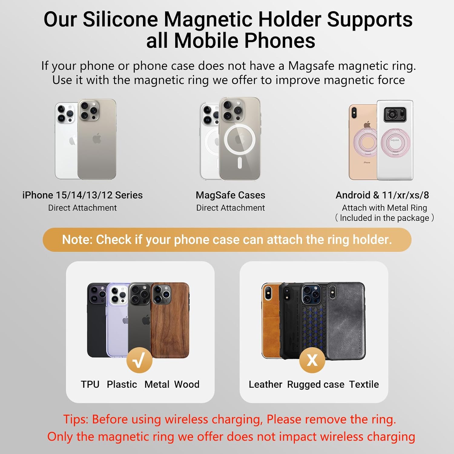 - ❤️【Customer Support】Our magsafe finger grip features a high-quality silicone grip ring for a comfortable, secure hold, you can normally lift your phone without any issues. Please do not deliberately pull or stretch the grip ring, as this may damage its integrity and reduce its effectiveness over time. If you feel magnetic is not enough, you can use it with metal rings that have an ultra-strong adhesive. We offer fast and friendly customer service within 24 hours for any of your questions.