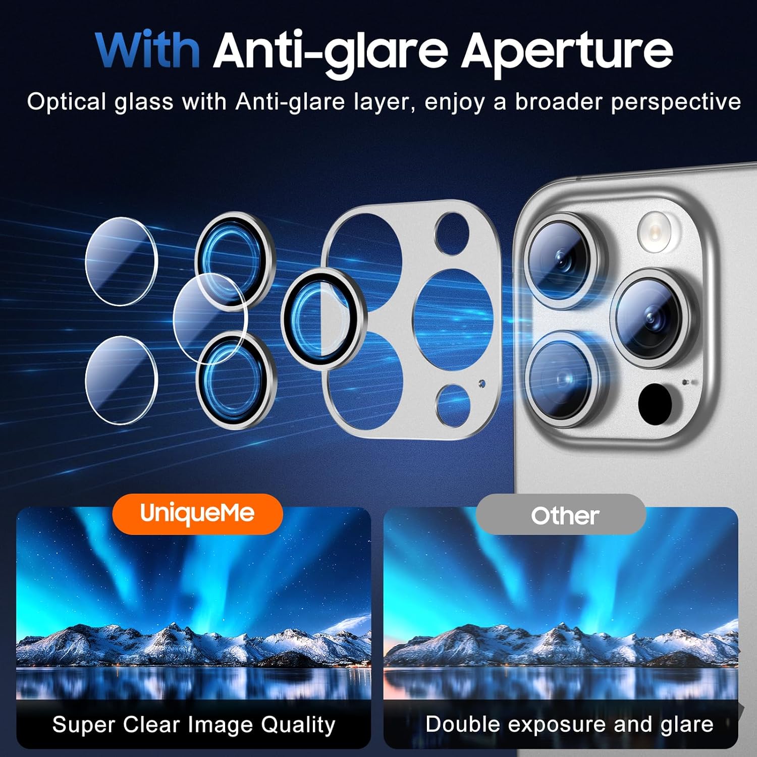 - 【4th Gen Upgraded Protection Design】UniqueMe iPhone 15 Pro / 15 Pro Max Camera Lens Protector has been designed to provide durable and effective protection for the camera lens. It has been upgraded to its 4th-Generation integrated version with Anti-glare Aperture and an Electroplated Sapphire Super Hard AF film camera protector screen.