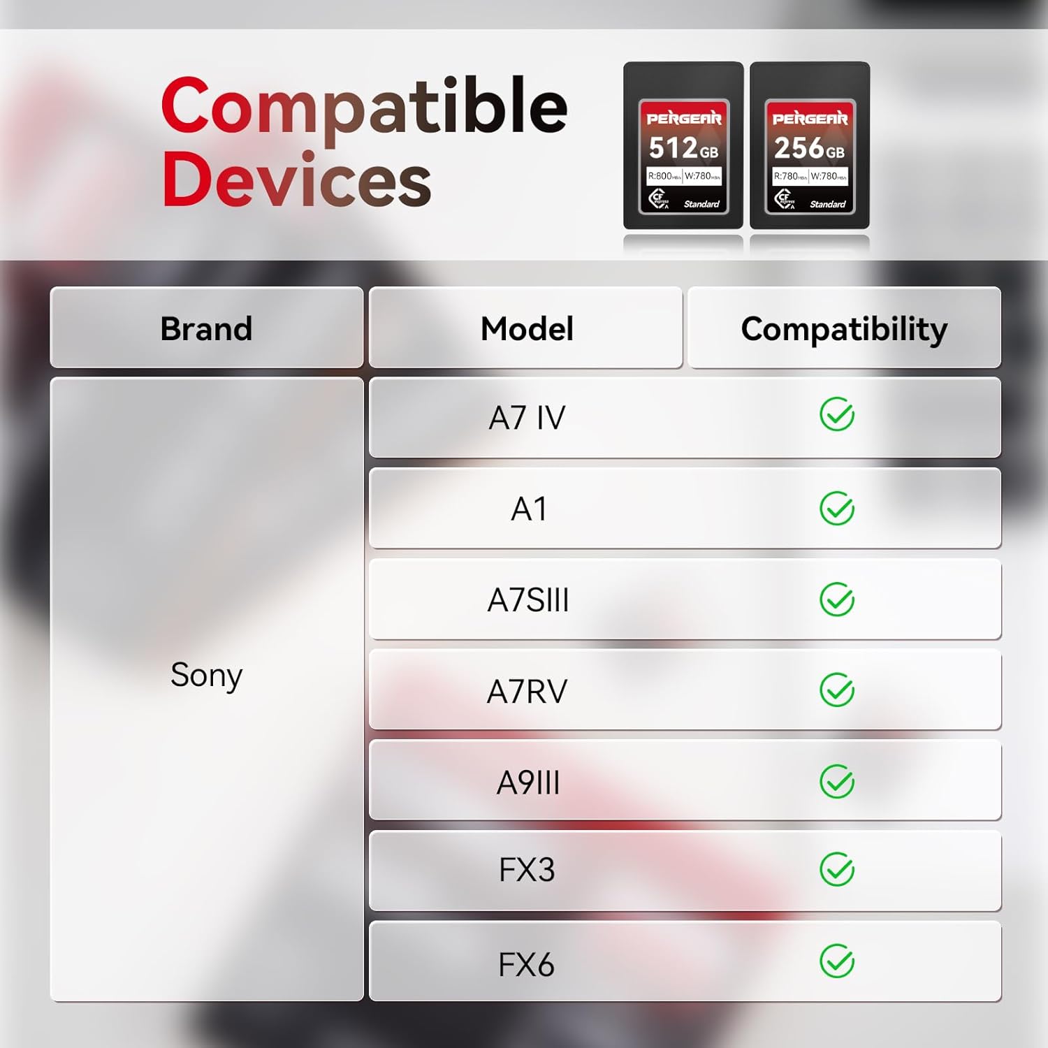 - 【Compatible Sony Alpha & FX Cameras】Pergear 256GB CFexpress Type A card has been approved for the Sony A7 IV、A1、A7SIII、A7RV、FX3、FX6、A9III cameras.