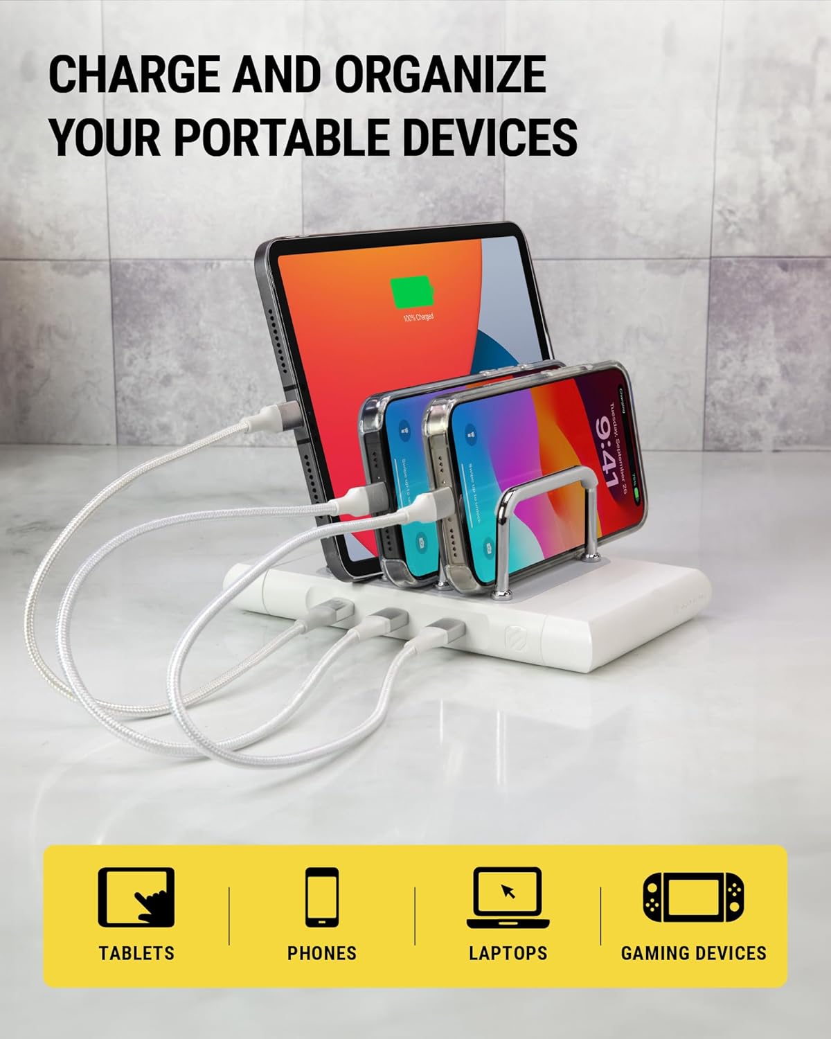 - Stylish Organizer: Store and quickly charge up to three devices with the Scosche charging station. The polished metal bars, padded silicone rails, and anti-slip pad create a secure holder for your phone and tablet. This elegant accessory not only enhances the look of your desk or night stand but also prevents scratches and slipping.